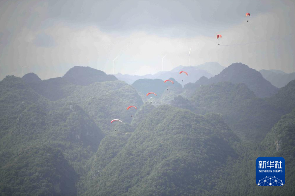 9月16日,运动员在开幕式现场展示滑翔伞运动。当日,2023国际山地旅游暨户外运动大会开幕式在贵州省黔西南布依族苗族自治州兴义市举行。新华社发(刘朝富 摄)