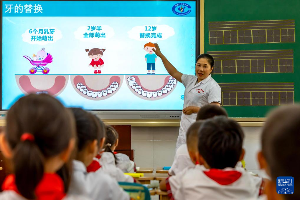 9月19日,医生在贵州省黔西市锦绣学校给学生讲解爱牙护牙知识。