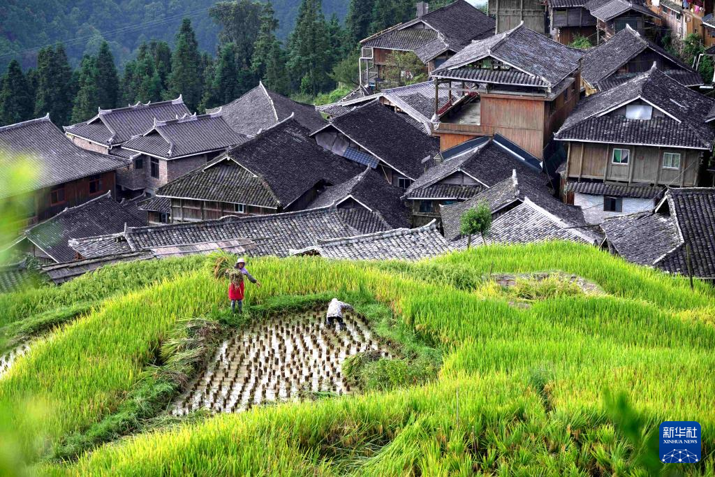 9月18日,村民在贵州省黔东南苗族侗族自治州雷山县西江镇黄里村抢收稻谷。