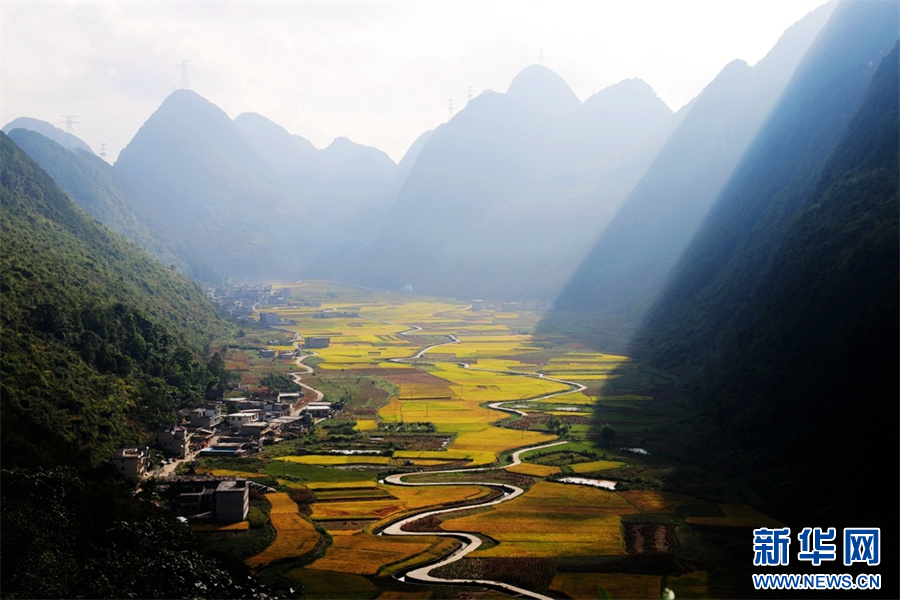 独特的喀斯特峰林地貌层峦叠翠,早晨的阳光顺着山脊一泻而下,把金黄的稻谷环抱(9月17日摄)。