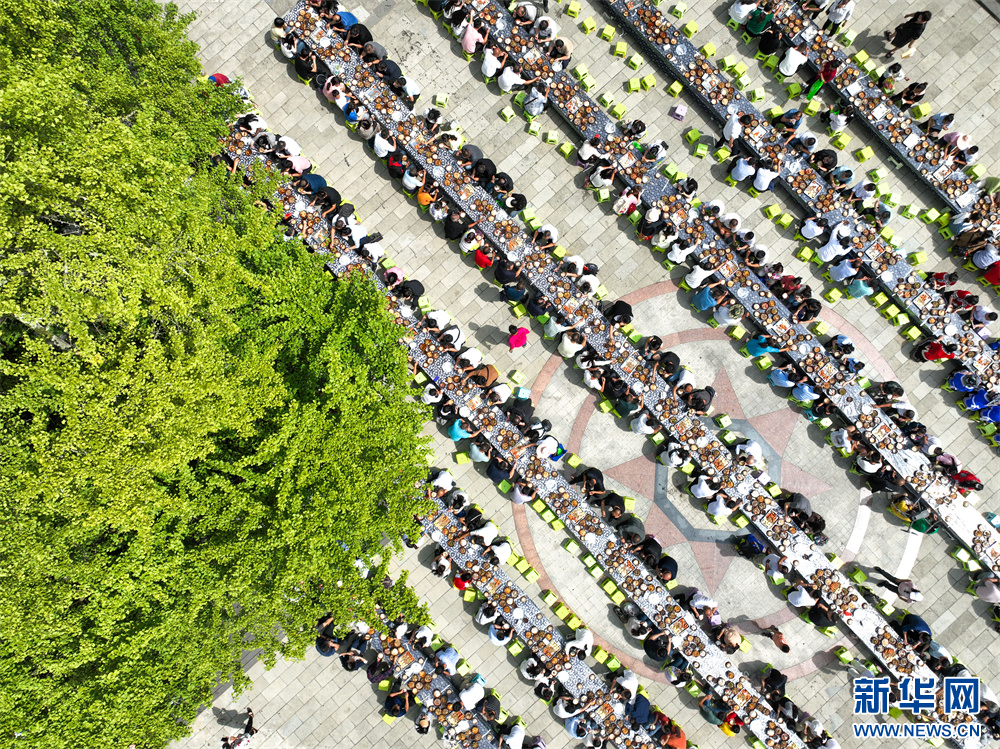 9月23日,游客和村民在丰收节活动中品尝长桌宴(无人机照片)。