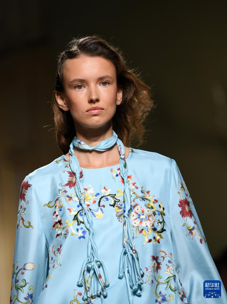 9月24日,模特在意大利米兰时装周上展示含有贵州苗绣元素的设计时装。