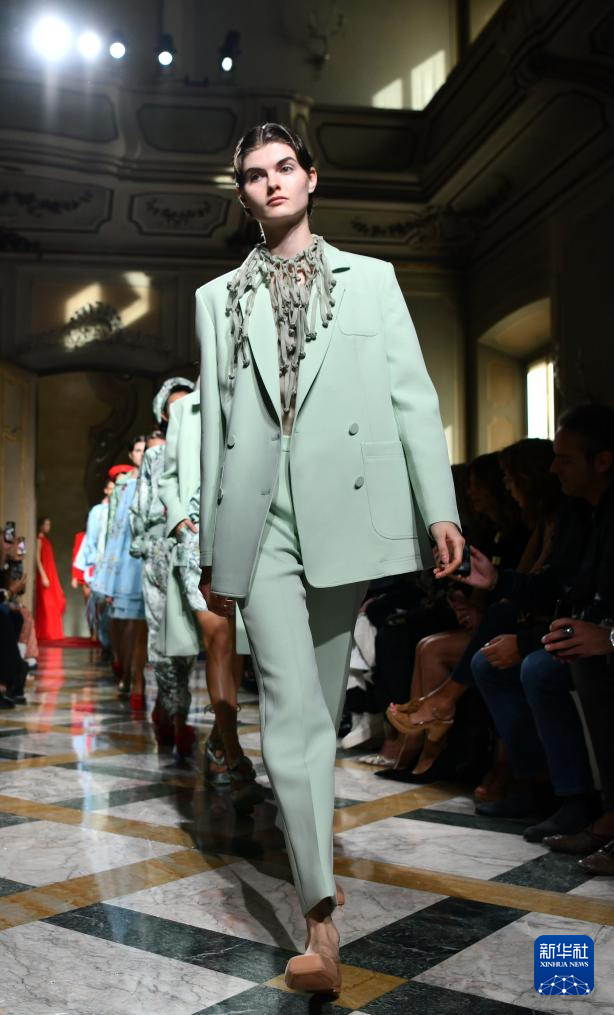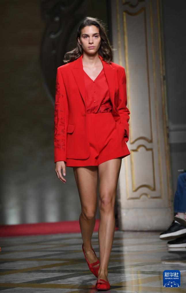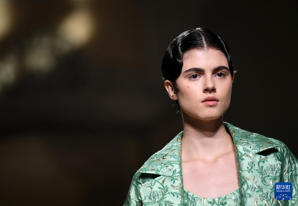 9月24日,模特在意大利米兰时装周上展示含有贵州苗绣元素的设计时装。新华社记者 金马梦妮 摄