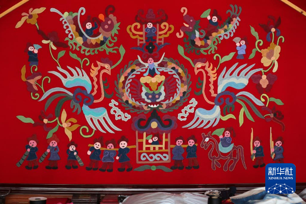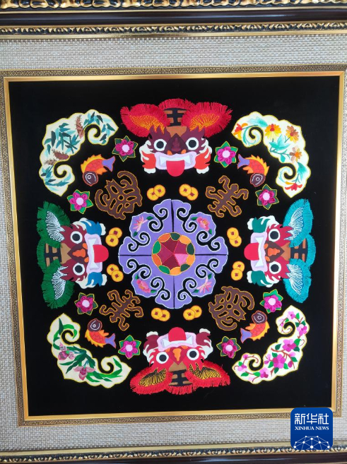 9月27日,苗绣传承人杨阿妮工作室里的苗绣《团圆过节》。新华社发(余天英摄)