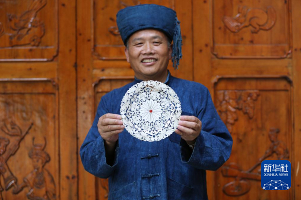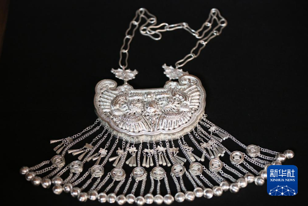 近日,国家级非物质文化遗产苗族银饰锻制技艺代表性传承人杨光宾制作完成一件银压领,选用双龙团聚的图案,耗时一个月手工打造。压领在苗族姑娘嫁妆中是必不可少的,外形像是放大了的汉族长命锁。
