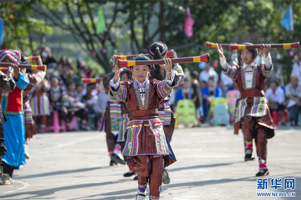 10月1日,苗族同胞在贵州省从江县西山镇高脚瑶寨瑶浴节上表演芦笙舞。新华网发(吴德军摄)