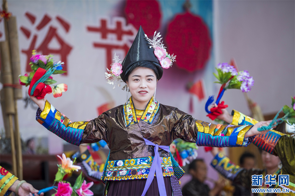 10月1日,瑶族同胞在贵州省从江县西山镇高脚瑶寨瑶浴节上表演民俗节目。新华网发(吴德军摄)