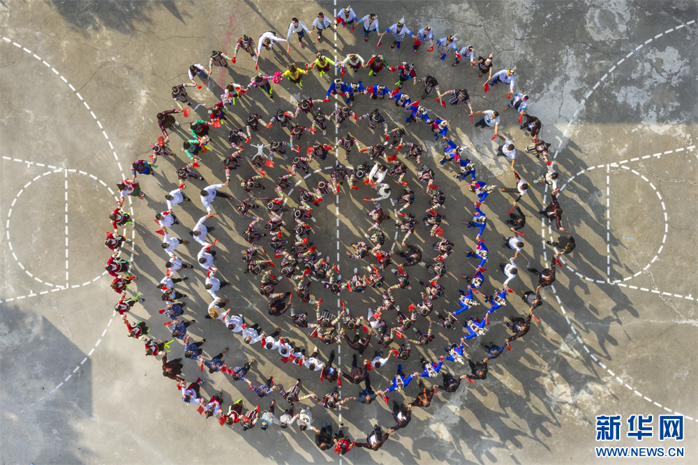 10月1日,人们在贵州省从江县西山镇高脚瑶寨瑶浴节上跳团结舞(无人机照片)。新华网发(吴德军摄)