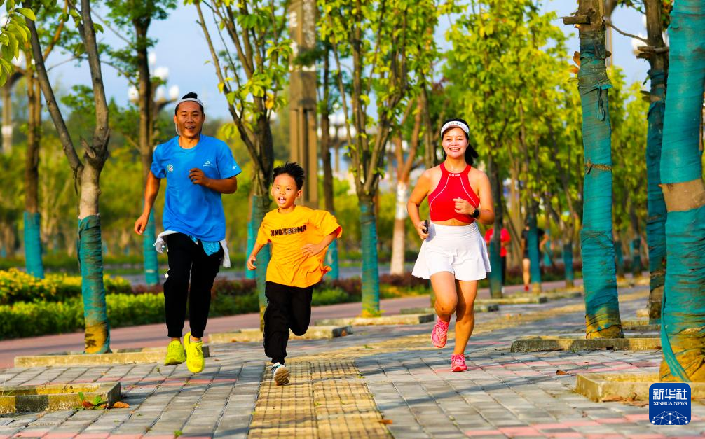 10月1日,人们在贵州省黔西市莲城街道环城林荫路上跑步。