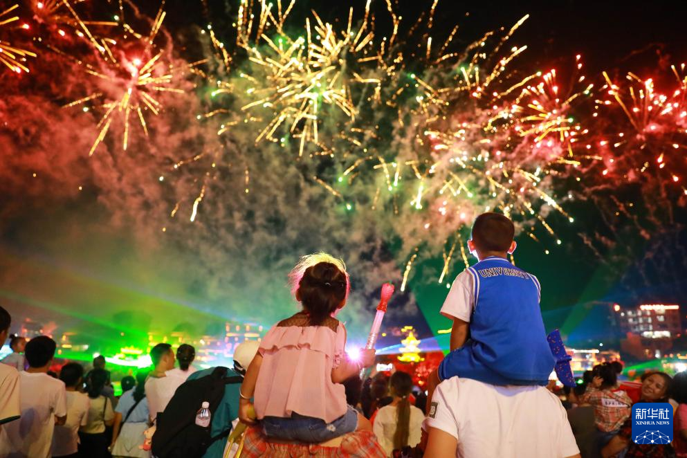 10月1日,游客在贵州省黔东南苗族侗族自治州凯里市下司古镇观赏烟花。