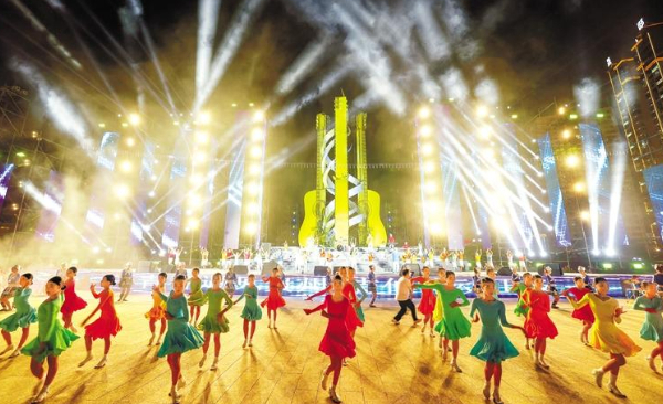 假日期间,正安县举办吉他弹唱大赛、吉他音乐演出、“摇滚之夜”展演等丰富多彩的文艺活动,吸引八方游客纷至沓来。图为10月1日,演员在吉他文化广场表演。 赵永章 摄(贵州图片库发)