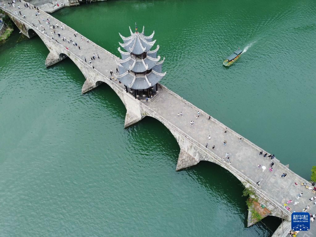 10月4日,游客在贵州省黔东南苗族侗族自治州镇远县古城游玩(无人机照片)。新华社发(邰胜智 摄)