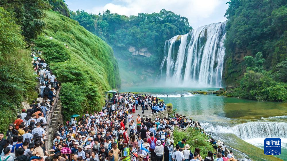 10月3日,游客在贵州省安顺市黄果树瀑布景区游玩(无人机照片)。