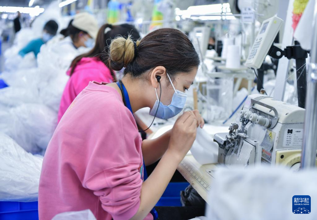 10月7日,工人在贵州省黔东南苗族侗族自治州三穗县一家运动服饰企业纺织车间工作。新华社发(龙兴伟 摄)