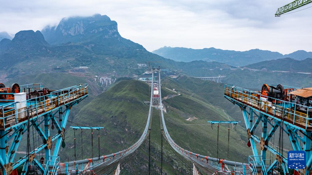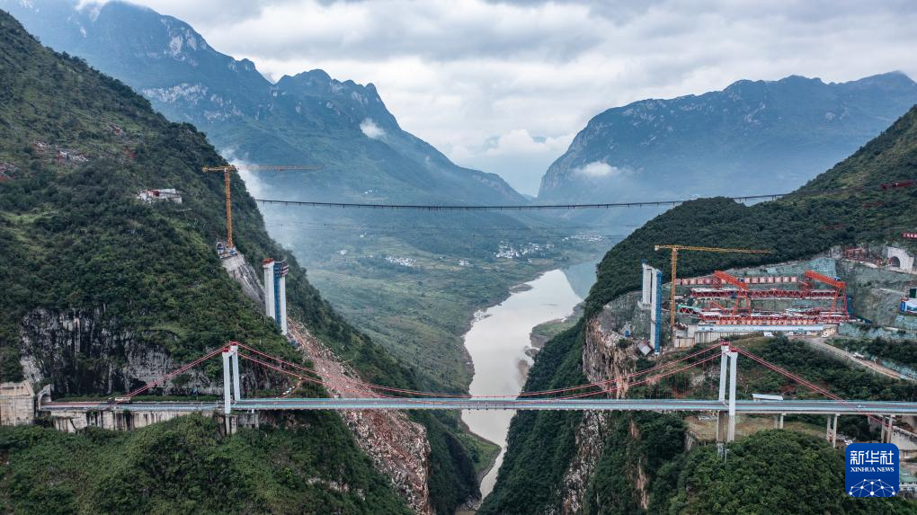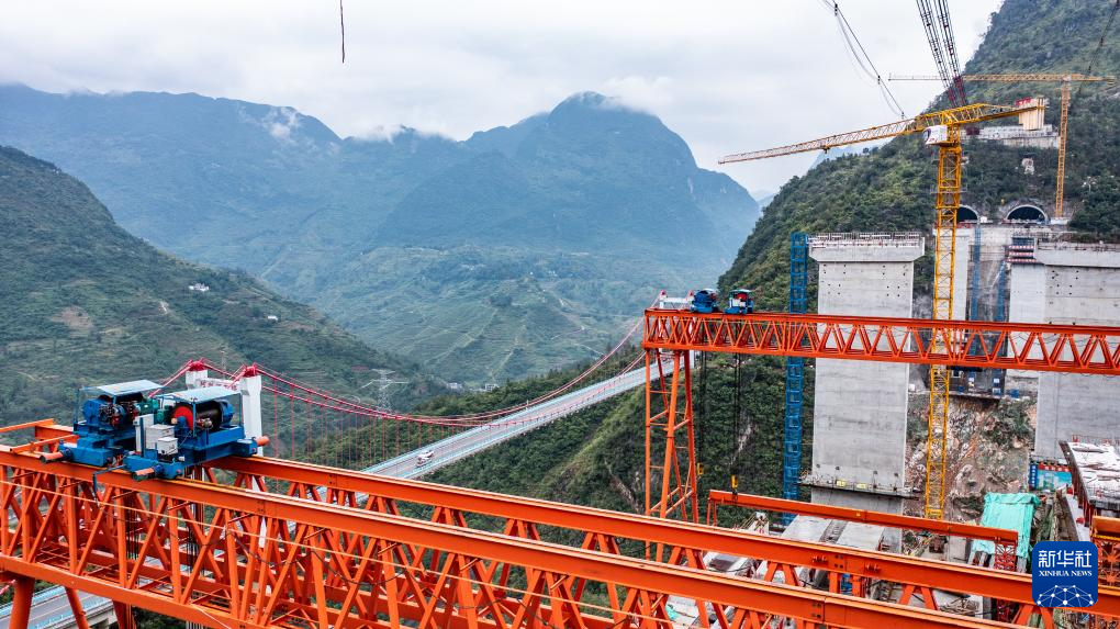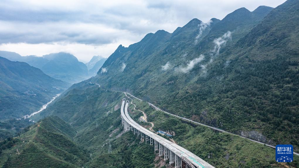 建设中的纳晴高速乌蒙山大桥(上方)(10月10日摄,无人机照片)。新华社记者 陶亮 摄