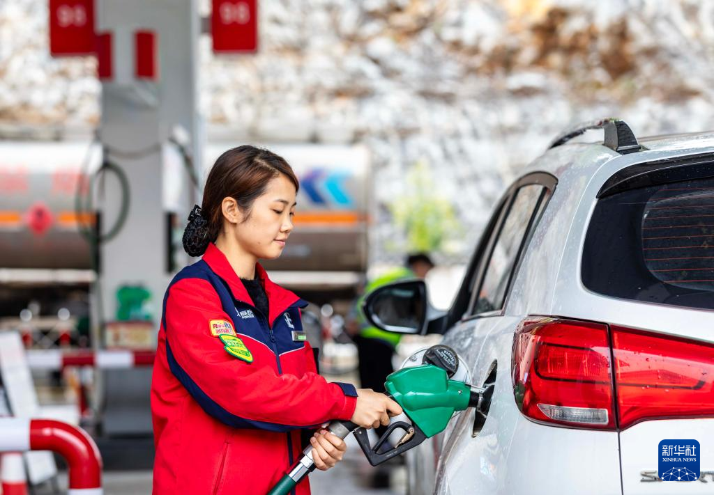 10月10日,贵州省安顺市一加油站的工作人员给汽车加油。新华社发(陈熙 摄)