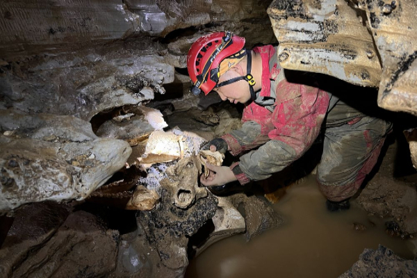 贵州省山地资源研究所工作人员在双河洞内发现古大熊猫化石。(贵州省山地资源研究所供图)