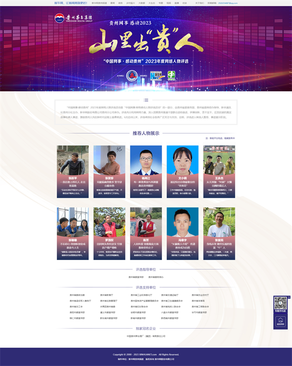 “中国网事·网络感动人物评选活动”是2010年经原中央外宣办批准,由新华社发起的国内首个以基层普通干部群众为报道和评选对象的网络评选活动,每年确定10名(组)入选年度网络人物,迄今已成功举办十三届,共有2000余名感动人物通过评选被网民所熟知。评选首年,贵州即有烤羊肉串的“慈善家”阿里木入选“中国网事·感动2010”年度网络人物。随后,贵州民族学院学生杨艾菁“戒指换教学楼”入选“中国网事·感动2012”年度网络人物,华中科技大学光学与电子信息学院贵州盘州籍学生冯盘龙增肥捐髓救人入选“中国网事·感动2013”年度网络人物,中国大山里的“海伦·凯勒”——贵阳白云三中盲人老师刘芳入选“中国网事·感动2015”年度网络人物,贵州织金籍的抗洪战士李金龙入选“中国网事·感动2016”年度网络人物,贵州籍残疾小伙李俊常州勇救落水母女入选“中国网事·感动2022”年度网络人物。