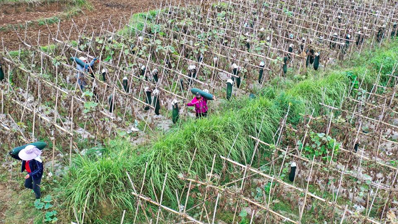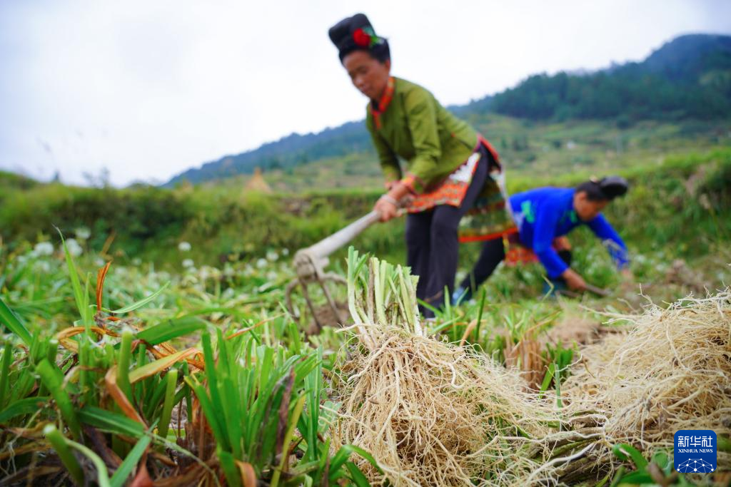 10月13日,村民在贵州省黔东南苗族侗族自治州丹寨县排调镇宰宿村韭菜根种植基地采收韭菜根。