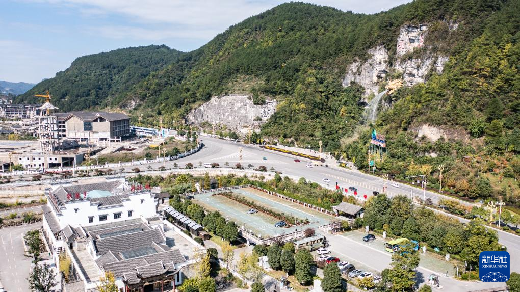 新能源汽车在黔南布依族苗族自治州龙里县龙山镇的充电桩设施充电(图右下)(10月17日摄,无人机照片)。新华社记者 陶亮 摄