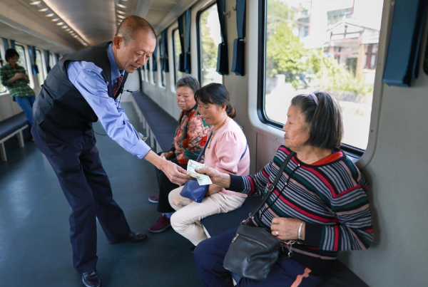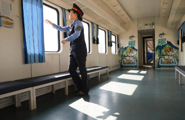 10月17日,5630次列车长在车厢内做准备迎接乘客。