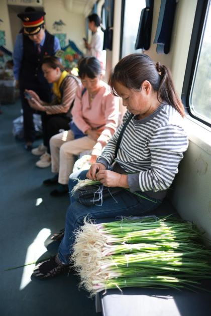 10月17日,沿线村民在5630次列车上售卖农产品。