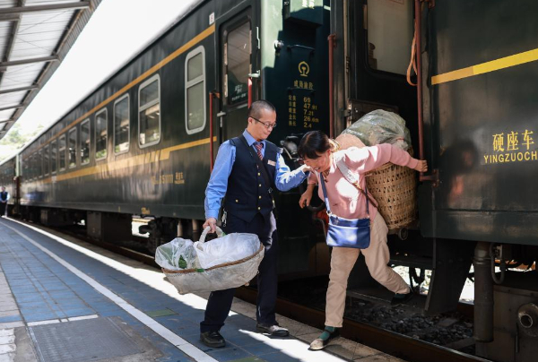 10月17日,5630次列车到达桐梓站后,村民携带农产品下车。