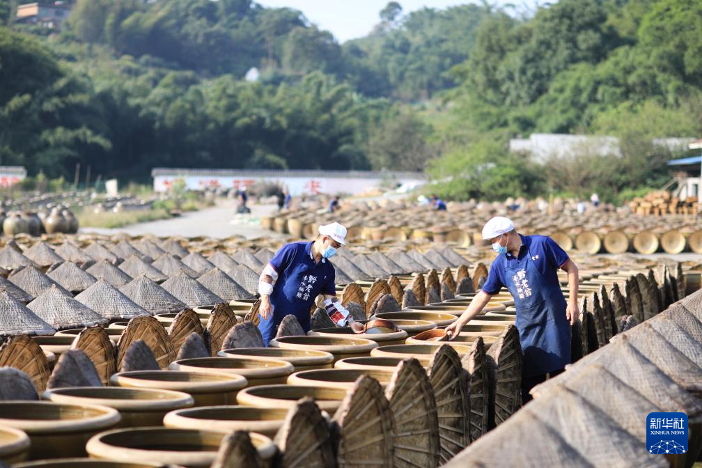 10月21日,在赤水市黔老翁醋厂,工人在晒醋晾晒区作业。新华社发(王长育 摄)