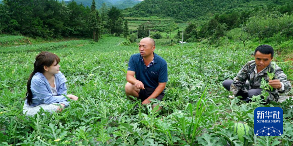 图为贵阳市乌当区新堡乡新堡村一农场负责人林正福查看西瓜生长情况。(韦登亮 摄)
