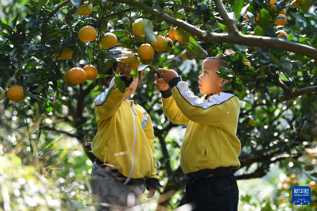 11月1日,贵州省黄平县新州镇第二幼儿园小朋友在校外劳动实践基地采摘柑橘。新华社发(陈孝新摄)