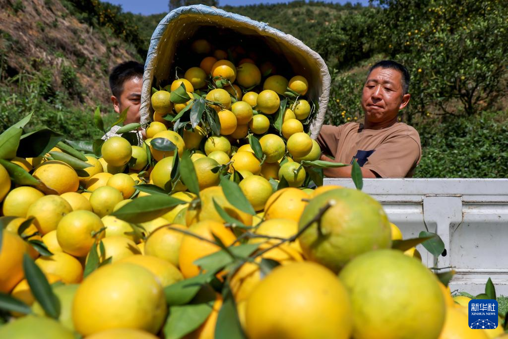11月1日,村民在贵州省岑巩县注溪镇周坪村思州柚种植基地采收柚子。