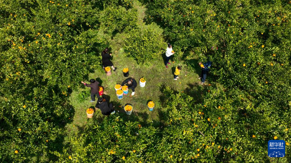 11月1日,果农在贵州省开阳县南龙乡土香村柑橘种植基地采摘、分拣柑橘(无人机照片)。新华社发(袁福洪摄)