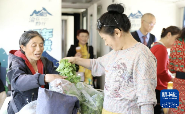 慢火车上的乘客在带货车厢中选购农户的蔬菜。新华社记者 周宣妮 摄