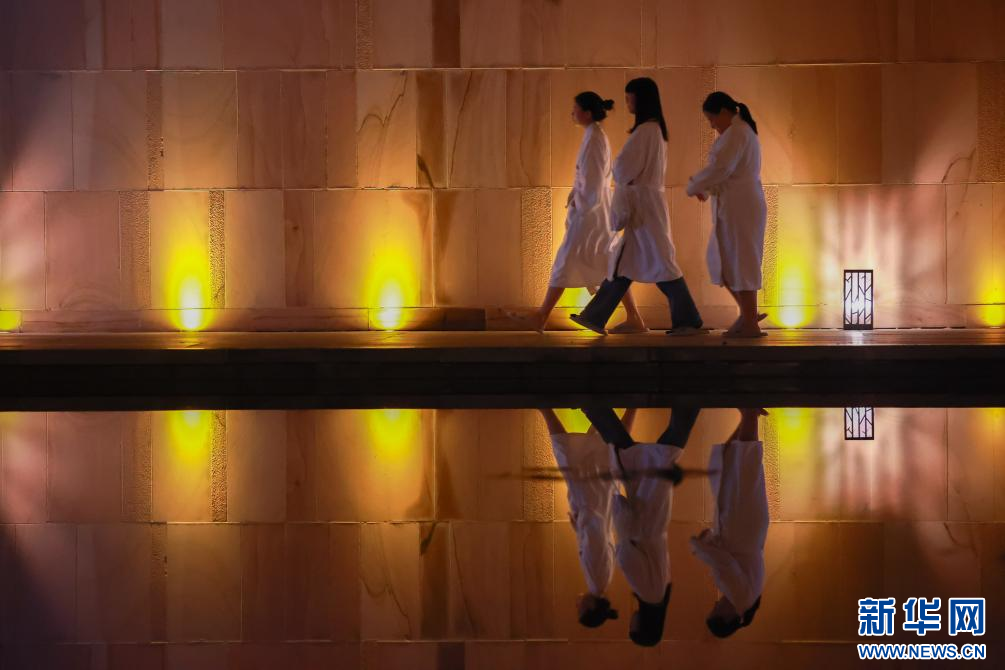 在石阡县佛顶山温泉小镇内,游客前去泡温泉(11月14日摄)。