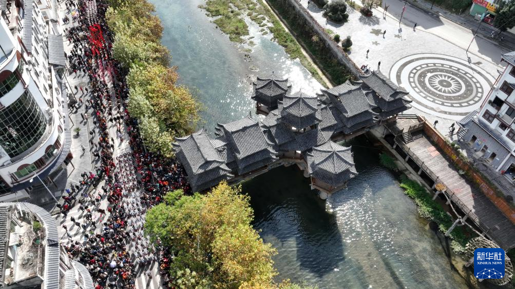 11月16日,在雷山县县城,苗族群众身着盛装,载歌载舞参加苗年和鼓藏节的巡游活动(无人机照片)。新华社记者 杨楹 摄