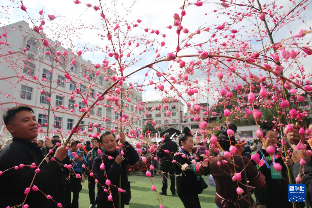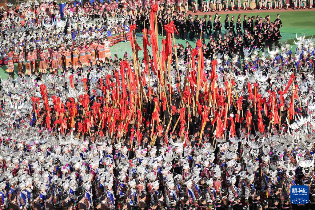 当日,贵州省黔东南苗族侗族自治州雷山县迎来苗族同胞的传统节日苗年。今年苗年又恰逢十三年一次的鼓藏节,欢乐气氛格外浓烈。来自县内外的数万名苗族群众欢聚雷山县城,通过盛装巡游、非遗展示、千人长桌宴等形式欢度节日。苗年和鼓藏节均为国家级非物质文化遗产。