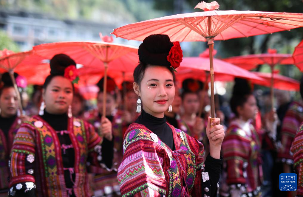 11月16日,身着节日盛装的苗族群众参加雷山县苗年盛装巡游活动。新华社发(黄晓海 摄)