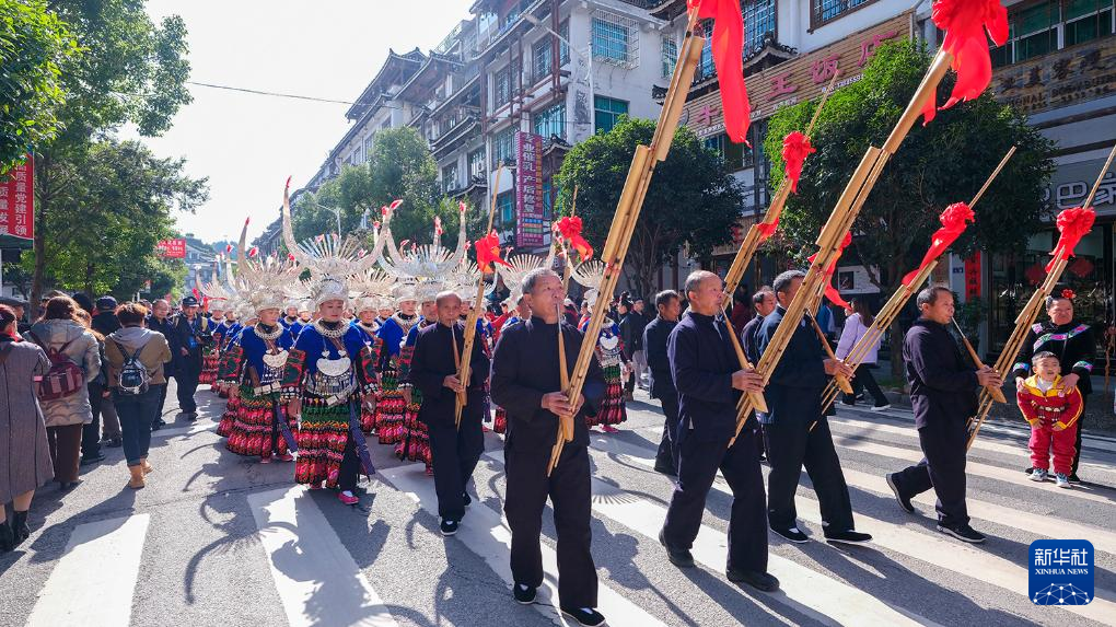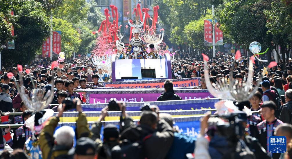 11月16日,在雷山县县城,苗族群众身着盛装,载歌载舞参加苗年和鼓藏节的巡游活动。新华社发(梁文 摄)