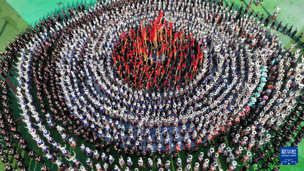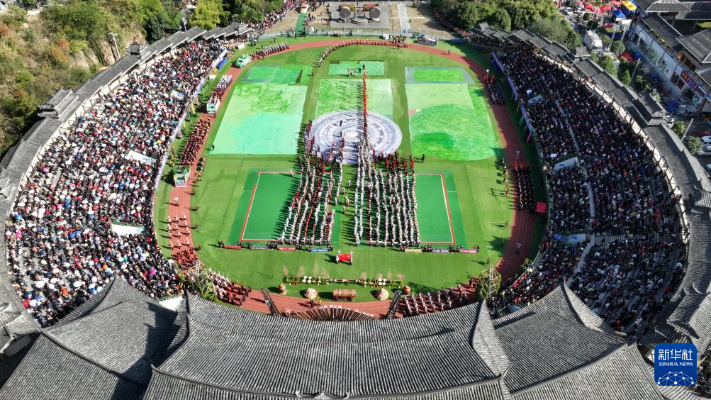 11月16日,在雷山县民族文化活动中心,苗族同胞身着盛装,载歌载舞欢庆苗年和鼓藏节(无人机照片)。新华社发(梁文 摄)