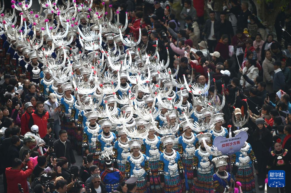 11月16日,在雷山县县城,苗族群众身着盛装,载歌载舞参加苗年和鼓藏节的巡游活动。新华社发(伍卫东 摄)