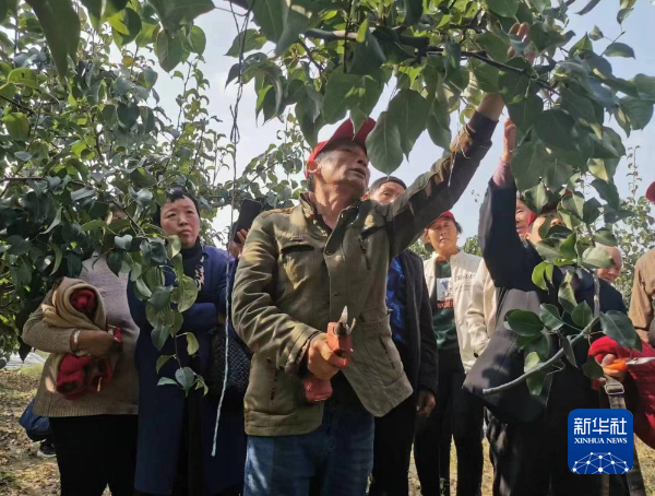 初冬时节,山西省运城市盐湖区西张耿村梨园里,村民们正围成一圈,中间一位老师对着一棵树,一边讲解一边示范如何做好梨树修剪。村民们听得津津有味,74岁的杨明存一边听,一边在笔记本上认真记。“这些种梨知识真管用,要常看常翻。”