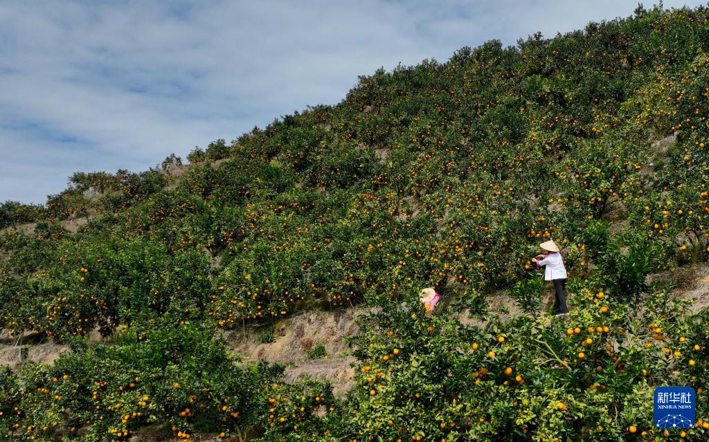 11月19日,员工在贵州省黔东南苗族侗族自治州榕江县古州镇料里村五榕脐橙种植基地采摘脐橙(无人机照片)。新华社发(袁福洪 摄)