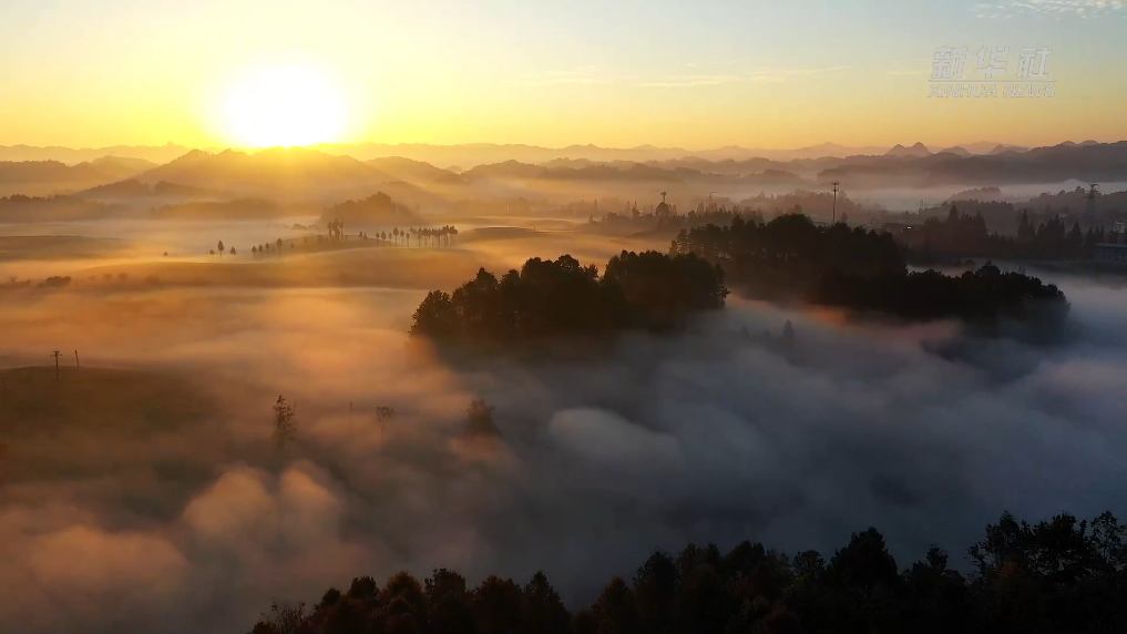 近日,贵州省湄潭县的中国茶海景区出现美丽的晨雾景观。配合着朝阳的光照,在朦胧的雾气中若隐若现的万亩茶海,宛如一幅令人赏心悦目的水墨画。