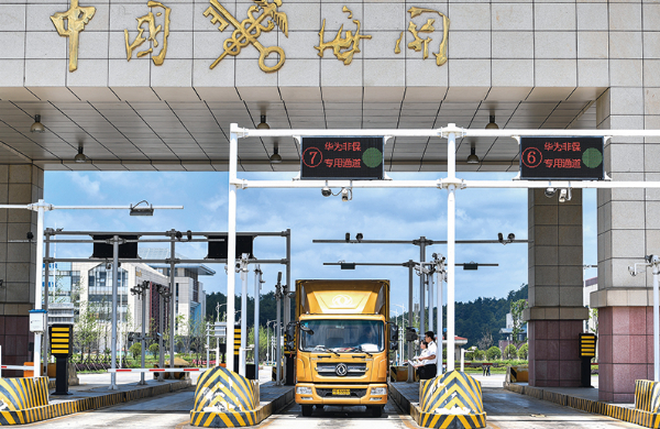 贵阳海关工作人员监管车辆通过海关卡口 贵阳海关供图