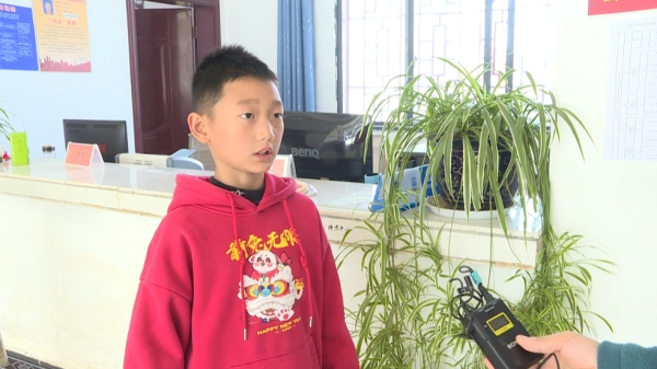 留守儿童杨博恩:“今天叔叔阿姨们给我准备的礼物我很喜欢,我以后要努力学习,争做一个德智体美劳全面发展的‘五好少年’。”