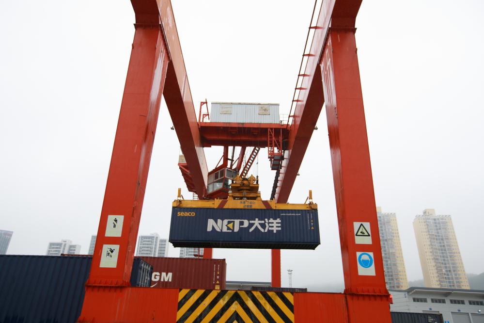 11月30日,一列中欧班列在贵阳国际陆港都拉营站装载集装箱。