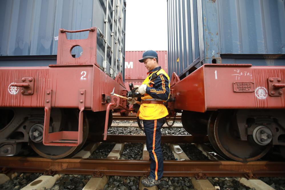11月30日,贵阳南车辆段工作人员对中欧班列进行开行前的检查。