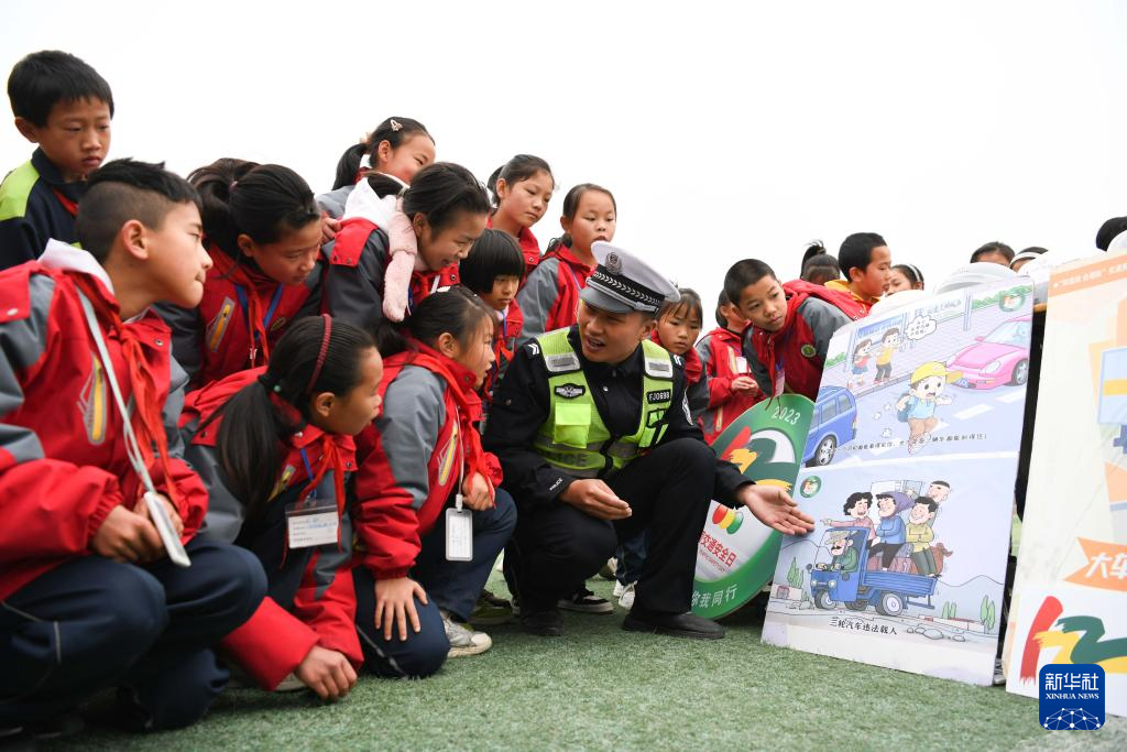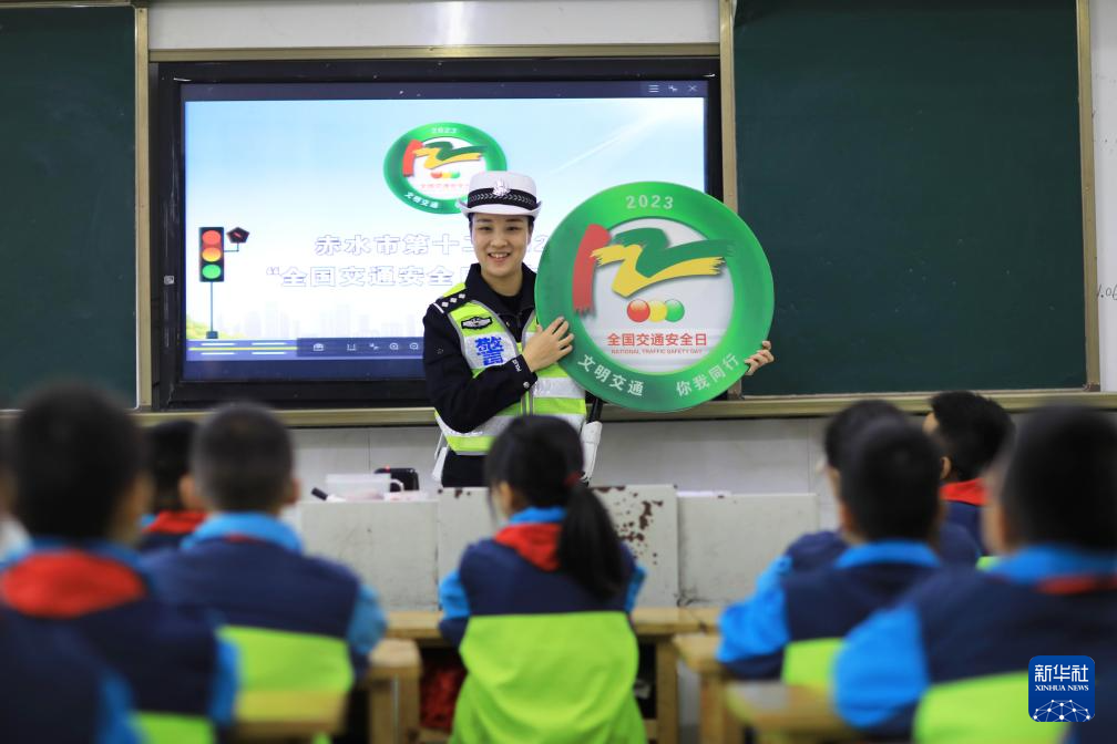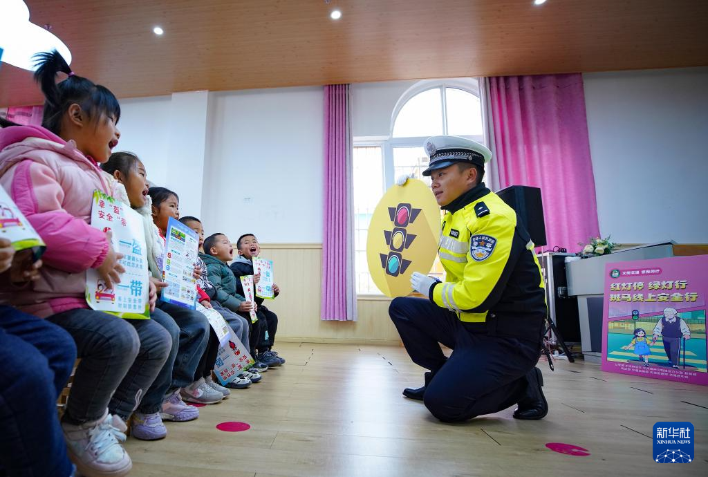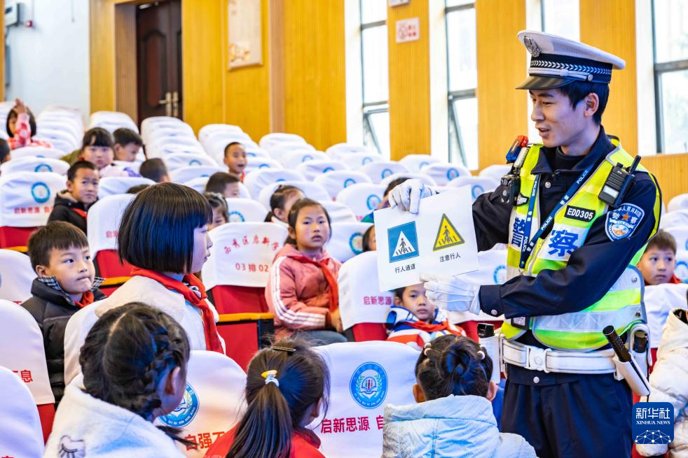 12月1日,交警在贵州省安顺市西秀区启新学校为学生讲解交通安全知识。新华社发(陈熙摄)