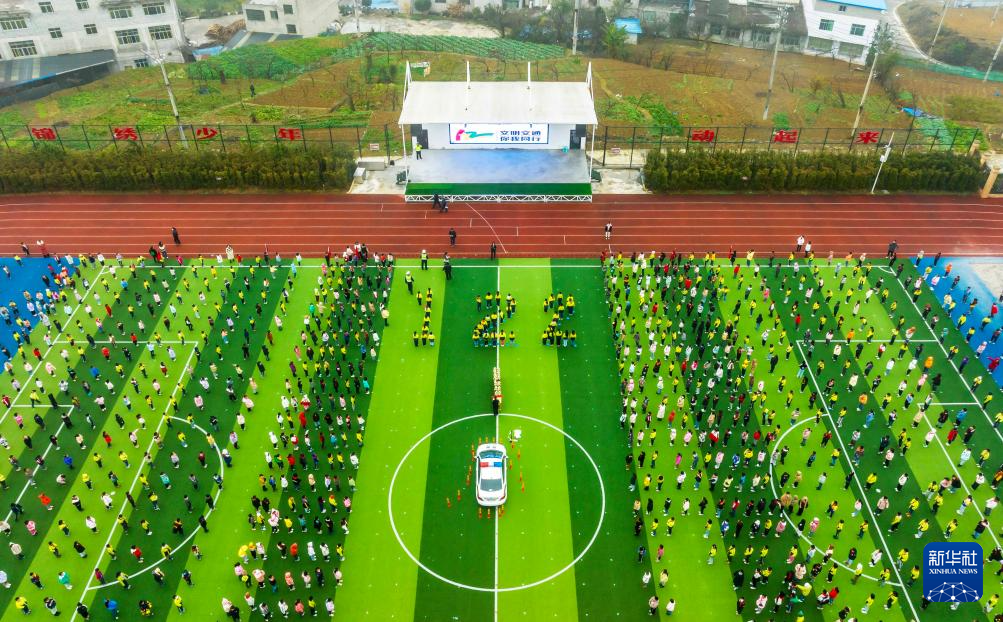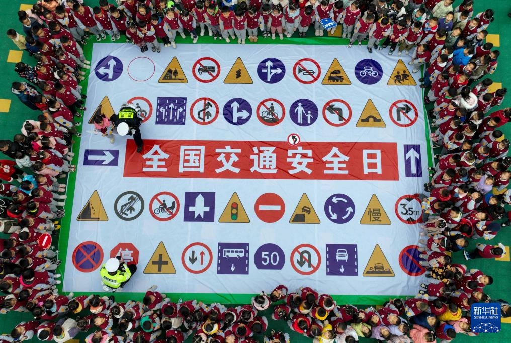 12月1日,交警在贵州省贵阳市乌当区振新幼儿园和孩子们一起做交通安全趣味游戏(无人机照片)。新华社发(袁福洪摄)