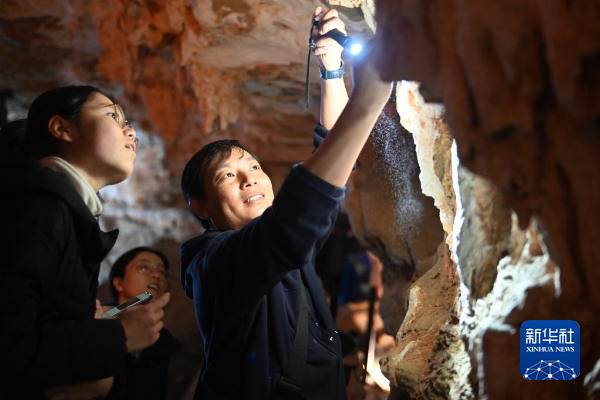 11月28日,贵州省山地资源研究所副所长周文龙正在介绍溶洞岩壁成分。新华社记者 周宣妮 摄
